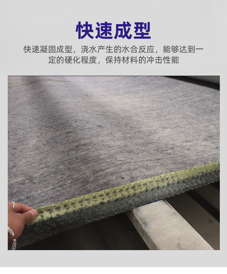 一旦浇水发生水合反应,在2小时内仍然可以对水泥毯大小形状进行必要的加工,24小时内,其能够硬化达到80%的强度。也能够按照用户的特殊要求,采用特殊配方达到快速凝固或者延迟凝固的目的。