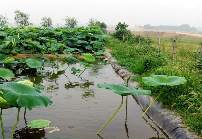 藕池建设池子不要太大,一般建议以一亩地大小为宜,这样便于管理。藕池挖掘深度以80厘米为宜,池塘挖好后整平夯实,铺设防渗膜,防渗膜铺设要由专业的焊接技术员施工,防渗膜铺设时要对焊接缝进行打压实验,以保证焊接质量。铺设防渗膜时尽量避免踩踏,防渗膜焊接前必须清除膜面砂子、泥土、油污、灰尘等脏物,保证膜面清洁。防渗膜施工在温度低于零下10度时应当提高焊接温度降低焊接速度。防渗膜铺设完成后再回填20厘米-30厘米的优质土层,藕池建设就算是基本完成。